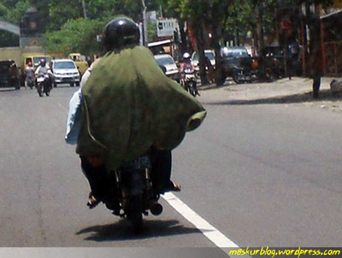 10. Nah, ini contoh model jilbab dan gamis yang menjuntai tanpa dibekangi, ngelihatnya begitu mengerikan. Jika Ukhti dibonceng demikian, inget yaa, harap jilbab diduduki dan gamis dilipet dikaki. Apalagi nutupi lampu sign, komplit banget deh Ukhti kalau sampai gini. Jangan sampai deh yaaaa... Demi Ukhti nih...
